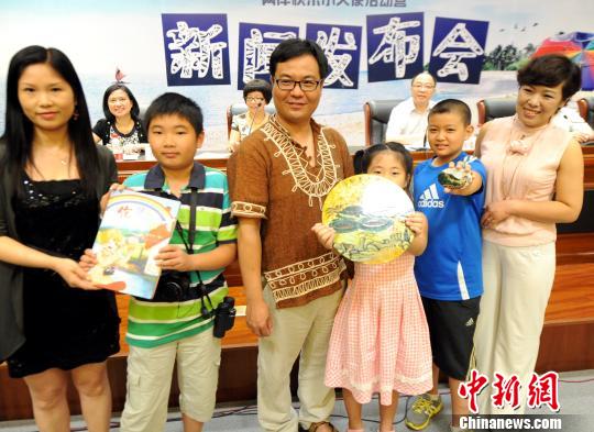 參加“2013?陽光海峽——兩岸快樂小天使活動(dòng)營” 新聞發(fā)布會(huì)的3位福建小營員代表及家長共同展示,屆時(shí)將贈(zèng)送臺(tái)灣小天使的禮物。 劉可耕 攝