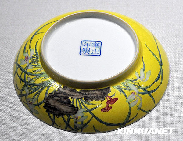 這是10月6日在臺北拍攝的清雍正瓷胎畫琺瑯黃地芝蘭圖盤。