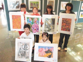 臺北縣與南京市合辦兩岸學(xué)童版畫交流展,兩岸獲獎學(xué)童開心拿著作品合影留念。聯(lián)合報圖