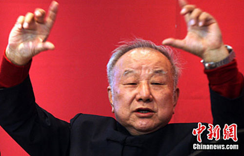 3月21日,《劉國(guó)松創(chuàng)作大展》在北京中國(guó)美術(shù)館展出。圖為劉國(guó)松先生在新聞發(fā)布會(huì)上向記者介紹作品。中新社發(fā) 錢(qián)興強(qiáng) 攝