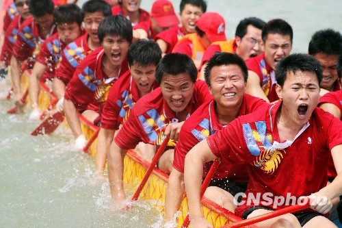端午節(jié)前夕,首屆海峽兩岸龍舟邀請(qǐng)賽6月12日在當(dāng)年中華民族的揚(yáng)威之地——山東省棗莊市臺(tái)兒莊的京杭古運(yùn)河上舉行,來(lái)自臺(tái)灣和浙江、江蘇、山東的13支代表隊(duì)以及由美國(guó)、法國(guó)、波蘭等地選手組成的國(guó)際友人代表隊(duì)的366名選手參加了比賽。圖為來(lái)自臺(tái)灣的龍舟代表隊(duì)在比賽中。 中新社發(fā) 閆鋒 攝