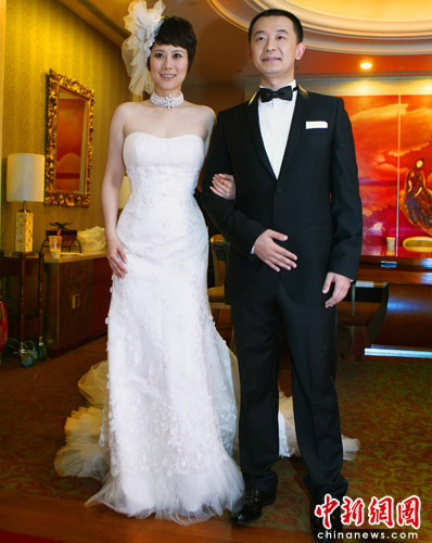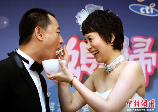 6月7日相關(guān)單位在臺北舉行記者會,劇中毛豆豆扮演者海清、余味扮演者黃海波身著結(jié)婚禮服到場與記者、影迷互動,會上“小兩口”相互喂食的甜蜜情節(jié),將活動推向高潮。中新社記者 宋吉河 攝