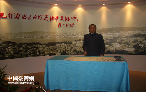在鄧小平同志視察廈門陳列室里,鄧小平題字的塑像吸引了眾多記者的目光。這個立體呈現(xiàn)的場景,重現(xiàn)了小平同志1984年視察湖里并題詞時,現(xiàn)場使用過的桌子、臺布、沙發(fā)及窗簾布等。塑像背后,正是當年小平同志的題詞:“把經(jīng)濟特區(qū)辦是更快些更好些!保ㄖ袊_灣網(wǎng) 趙靜 攝)