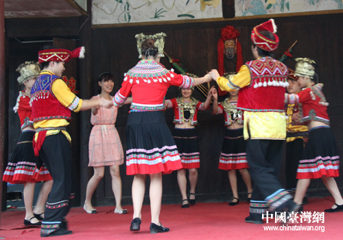 臺灣非凡電視臺記者與廣西少數(shù)民族進(jìn)行互動表演。(圖片來源:廣西臺辦)