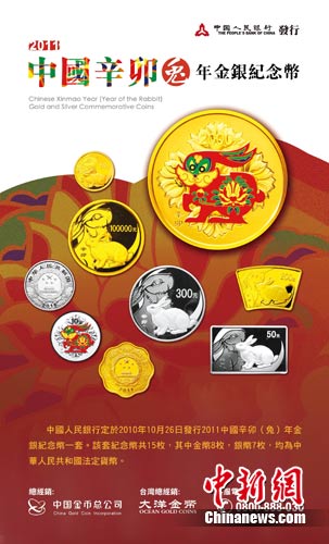 圖片說明:2011年辛卯兔年將至,圖為正在熱銷2011中國(guó)辛卯(兔)年金銀紀(jì)念幣的中國(guó)金幣總公司在臺(tái)灣的總經(jīng)銷,位于臺(tái)北市和平東路三段68之1號(hào)的臺(tái)灣大洋金銀幣公司的推介廣告。