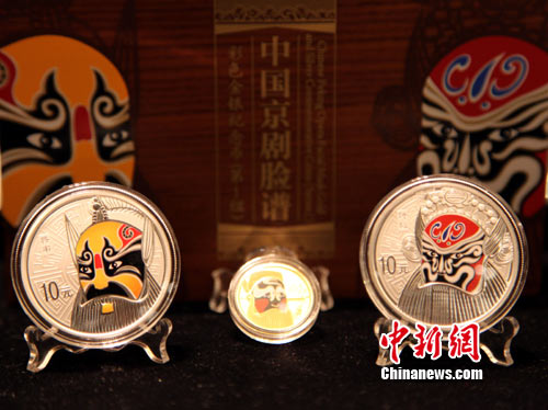 中國(guó)人民銀行發(fā)行的中國(guó)京劇臉譜彩色金銀紀(jì)念幣(第1組),其中金幣1枚,銀幣2枚,2010年在臺(tái)灣面市。圖為去年11月16日,中國(guó)金幣總公司在臺(tái)灣的總經(jīng)銷,位于臺(tái)北市和平東路三段68之1號(hào)的臺(tái)灣大洋金銀幣公司展售的該套金銀紀(jì)念幣。