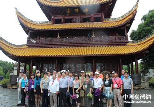 高雄市新聞參訪團與湖南省臺辦、岳陽市陪同領(lǐng)導(dǎo)在岳陽樓前合影。(圖片來源:岳陽市臺辦)