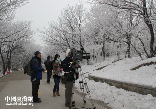 攝制組一行先后在玉女峰、水簾洞、毛公碑等核心景點及花果山大道等地進(jìn)行采訪拍攝。攝制組登上山頂時,恰逢霧凇景觀,整個山頂?shù)臉淞窒袷桥狭吮”〉你y裝,引得攝影記者久久不愿離開。臺灣記者們還格外關(guān)注一個問題“孫悟空的老家在哪個花果山”,并最終在著名景點——毛公碑找到了答案,連忙拍下碑文內(nèi)容:孫猴子的老家在新海連市云臺山——毛澤東。