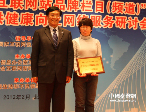 中國互聯(lián)網(wǎng)協(xié)會副理事長高盧麟(左)為中國臺灣網(wǎng)頒獎。(中國臺灣網(wǎng) 吳彤 攝)