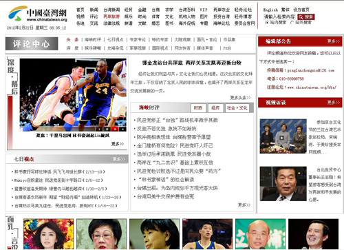中國臺灣網(wǎng)評論中心(http://www.com3y.cn/plzhx/)以涉臺評論為自己的特色,兼顧大陸與國際時評,成立十余年來已在兩岸網(wǎng)友及互聯(lián)網(wǎng)業(yè)界樹立起了權(quán)威涉臺評論品牌形象。中國臺灣網(wǎng)評論中心內(nèi)設(shè)“海峽時評”、“專家專論”、“深度幕后”、“網(wǎng)友快言”等十余個精品欄目,既有臺灣時政、社會類話題的評論,也有兩岸專家解析臺海風(fēng)云的“點睛之筆”、兩岸網(wǎng)友爭相熱議的“一家之言”,還有該頻道編輯就某一熱點事件精選各方觀點為網(wǎng)友呈上的“專題大餐”。2012年,中國臺灣網(wǎng)“評論中心”頻道即將推出新版,期待兩岸網(wǎng)友一如既往的支持。