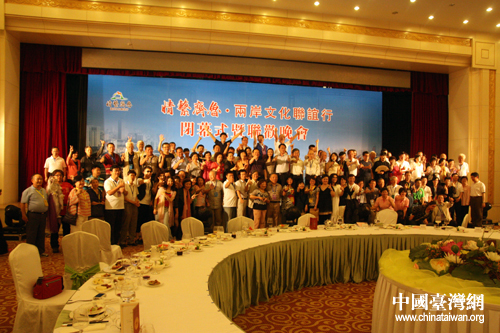 聯(lián)歡會(huì)結(jié)束時(shí),全體兩岸嘉賓一起涌上臺(tái)前留下難忘合影。(中國(guó)臺(tái)灣網(wǎng) 蕪?fù)?攝)
