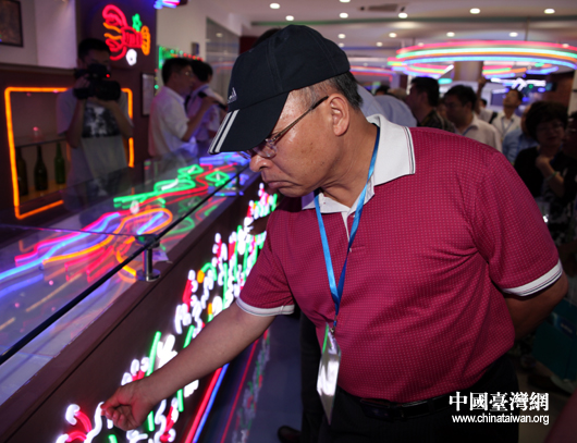 6月8日,兩岸專家學者組成的節(jié)能環(huán)保參訪團來到鶴山麗得電子實業(yè)有限公司餐館LED技術應用,圖為專家在觸摸可隨意彎曲的LED軟燈。(中國臺灣網(wǎng) 鐘寶華 攝)