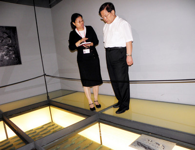 大陸文化部長(zhǎng)蔡武(右)2日參訪臺(tái)“中研院”史研所的歷史文物陳列館,仔細(xì)聽(tīng)館方人員解說(shuō)。