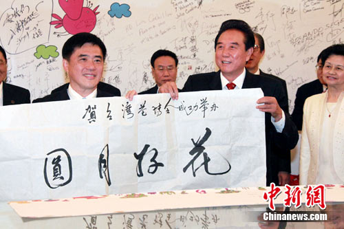 在臺(tái)北花博營(yíng)運(yùn)總部,臺(tái)北市長(zhǎng)郝龍斌向陳云林致贈(zèng)瓷兔,陳云林則回贈(zèng)自己的書(shū)法“花好月圓”。作者:黃少華