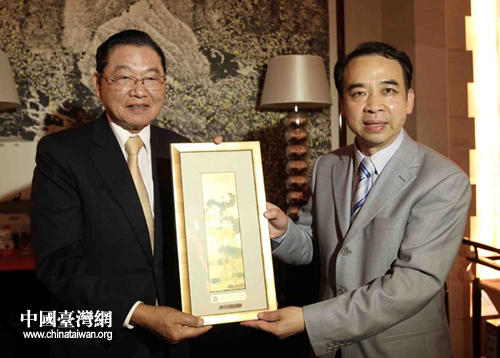 ;鶗麻L江丙坤向襄陽市委書記范銳平贈送紀念品。(趙興沛 攝)