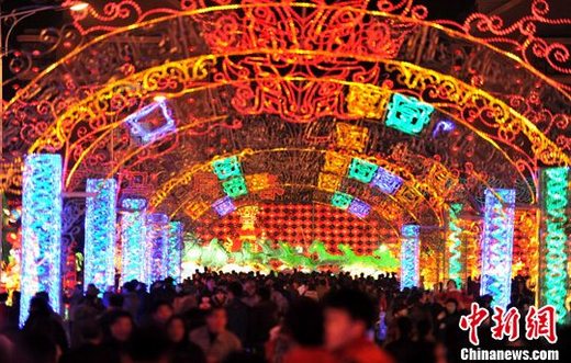 福州馬尾近600萬(wàn)平方米的兩馬元宵花燈展區(qū)內(nèi)113余組大中小型彩燈、彩門(mén)12日晚正式亮燈,以此開(kāi)啟2011年“兩馬同春鬧元霄”系列活動(dòng)的序幕。