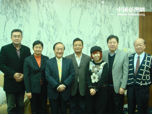中共石景山區(qū)委常委、紀(jì)委書記剛杰(左三),中共石景山區(qū)委常委、常務(wù)副區(qū)長王春杰(右一)、石景山區(qū)副區(qū)長陳雙(左一)與新黨主席郁慕明(左二)合影。ㄖ袊_(tái)灣網(wǎng)發(fā))