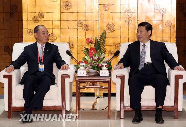4月10日,國家副主席習(xí)近平在海南省博鰲會(huì)見出席博鰲亞洲論壇2010年年會(huì)的臺(tái)灣兩岸共同市場(chǎng)基金會(huì)最高顧問錢復(fù)。 新華社記者樊如鈞攝