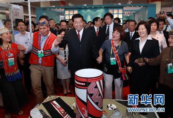 在展館現(xiàn)場,賈慶林饒有興趣地參觀了來自兩岸各地的特色展區(qū)。他來到臺灣少數(shù)民族工藝品展區(qū),和身著民族服裝的臺灣少數(shù)民族同胞手拉手跳起了歡快的舞蹈。在臺灣宜蘭的展臺前,他品嘗了臺灣特色小吃。賈慶林指出,兩岸文化同根同脈,兩岸文化產(chǎn)業(yè)合作潛力巨大。我們要抓住機遇,推動文化產(chǎn)業(yè)合作實現(xiàn)優(yōu)勢互補,共同做強做大中華文化產(chǎn)業(yè),大力提升中華文化在國際上的影響力和競爭力。要深入發(fā)掘中華傳統(tǒng)文化資源,共同打造一批具有中華民族特色、風(fēng)格、氣派的知名文化品牌,不斷增進兩岸同胞的心靈溝通與情感交融,增強中華民族凝聚力。