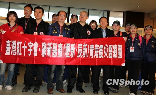 4月18日上午9時許,臺灣紅十字組織醫(yī)療團搭乘華航CI641班機啟程,經(jīng)香港、北京轉(zhuǎn)機,赴青海西寧協(xié)助救治傷員。臺灣紅十字組織秘書長陳士魁(前排左四)前往桃園機場送行。 中新社發(fā) 董會峰 攝
