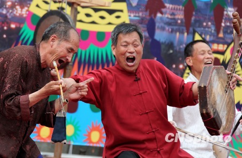 5月1日下午,陜西民間藝術(shù)園游會在臺北華山創(chuàng)意文化園區(qū)登場,藝術(shù)家們地道的“絕活”表演吸引了數(shù)百臺灣民眾。圖為陜西華陰“老腔”樂師在舞臺上賣力叫唱,極具感染力,轟動全場。 中新社發(fā) 董會峰 攝