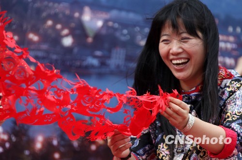5月1日下午,陜西民間藝術(shù)園游會在臺北華山創(chuàng)意文化園區(qū)登場,藝術(shù)家們地道的表演吸引了數(shù)百臺灣民眾。圖為享譽(yù)國際的國寶級剪紙藝術(shù)家樊曉梅登臺表演剪紙“絕活”,作品隨風(fēng)飄散。 中新社發(fā) 董會峰 攝