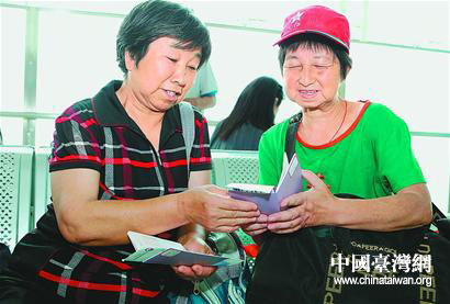 6月21日,兩位旅客在查看赴臺灣花蓮包機機票。(圖片來源:濟南市臺辦)