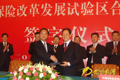 中國保監(jiān)會(huì)主席吳定富(右)與廈門市市長劉賜貴(左)簽字后握手。(你好臺(tái)灣網(wǎng) 周步恒攝)