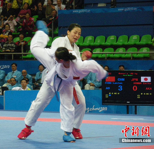 26日,亞運史上首次空手道“海峽德比”在廣東體育館上演,最終在女子68公斤級半決賽中,中國選手馮蘭蘭通過延長賽以3比0完勝中華臺北選手劉亞力,并在決賽中力克日本選手本間繪美子奪冠。