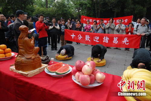 中新網(wǎng)成都4月17日電 (記者 楊杰)17日上午,在“三國圣地”成都武侯祠博物館三義廟,臺灣民間文化團體“十分老街觀光發(fā)展協(xié)會”舉行了隆重的祭典儀式,恭迎先賢忠烈“諸葛亮”赴臺,以弘揚忠、義、仁、智的精神。