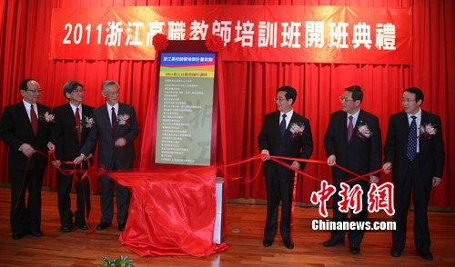 由浙江省高等教育學(xué)會(huì)和臺(tái)灣科技大學(xué)共同舉辦的 “浙江在臺(tái)高校師資培訓(xùn)基地掛牌及2011浙江高職教師培訓(xùn)班開(kāi)班儀式”今天下午在臺(tái)北舉行。
