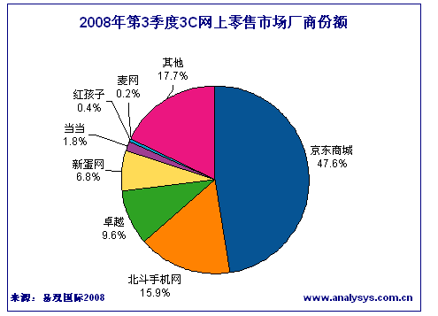 據(jù)易觀國際(Analysys International)對中國B2C網(wǎng)上零售市場的最新銷售統(tǒng)計,得益于中國3C市場的快速發(fā)展,專注于3C產品在線銷售的京東商城在6月份的營業(yè)額超過1億元人民幣,成為首個單月交易額過億元的中國B2C網(wǎng)上零售廠商,季度3C產品銷售額達到4.04億,以47.6%的3C網(wǎng)上零售市場份額領跑該市場。