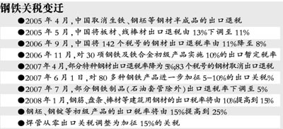“半個(gè)月以來幾乎天天加班,希望能夠把下個(gè)月要交貨的量提到這個(gè)月完成!闭憬撹F集團(tuán)有限公司銷售科的李磊在電話里對(duì)記者說。鋼材企業(yè)突然手忙腳亂,與鋼鐵產(chǎn)品出口關(guān)稅將在2008年后再次調(diào)整有直接關(guān)系。