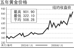 企業(yè)惜售,主要受金價預(yù)期上升影響。從2002年開始,黃金進入新一輪牛市。行情在去年8月之后加速。據(jù)中國黃金協(xié)會副會長侯惠民介紹,去年8月至10月,每盎司金價漲了200美元,達(dá)到上世紀(jì)80年代高點的每盎司850美元。2008年1月9日,國際黃金價格更是沖破歷史高點,一直持續(xù)到14日創(chuàng)下新高,最高至914美元/盎司。專家預(yù)測,2008年,金價還是處于上升通道。