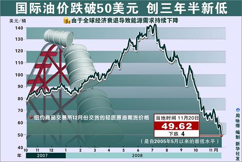 由于經濟衰退導致能源需求持續(xù)下降,國際油價上周累計下跌約12%,紐約市場油價更是跌破了每桶50美元,上周五紐約商交所一月輕質原油期貨結算價報收于每桶49.93美元。從7月11日創(chuàng)下每桶147.27美元的歷史最高記錄以來,國際油價已經累計下跌六成多。