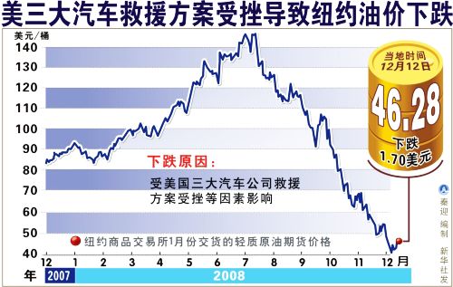 受美國三大汽車公司救援方案受挫等因素影響,12月12日國際油價(jià)下跌,紐約油價(jià)跌至47美元之下。