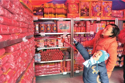 石景山魯谷市場門前的煙花爆竹攤點內(nèi),一位母親帶著孩子在選購煙花爆竹。 (記者 胡雪柏攝)