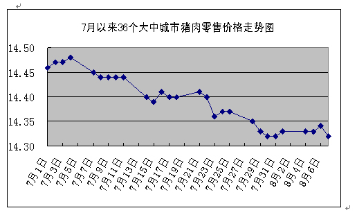 據(jù)國家發(fā)改委網(wǎng)站消息,發(fā)改委價格監(jiān)測中心監(jiān)測顯示,上周(8月4日~8月7日)全國36個大中城市集市、超市豬肉(精瘦肉)平均零售價格每500克為14.33元,與前一周(7月28日~8月1日,下同)持平。