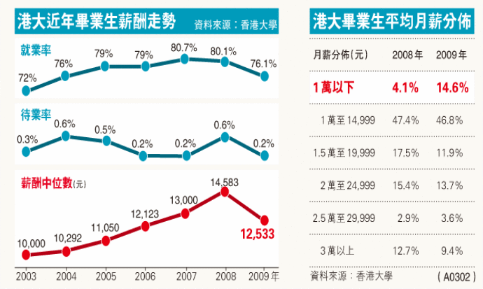 港大昨公布09年畢業(yè)生就業(yè)情況,在受訪的約3100名本科畢業(yè)生中,不計(jì)算醫(yī)生和牙醫(yī)等“高薪族”,09年畢業(yè)生薪酬中位數(shù)為12,533元,較08年急跌14.1%,返回06年水平。另外,學(xué)生就業(yè)率只有76.1%,較08年下跌4個(gè)百分點(diǎn),與04年水平相若。