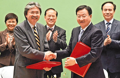 香港財政司司長曾俊華與國家商務(wù)部副部長姜增偉昨日簽訂CEPA第7份補充協(xié)議,在19個領(lǐng)域共35個措施中,其中14個服務(wù)領(lǐng)域的27項獲開放市場,涉及建筑、醫(yī)療、技術(shù)檢驗分析與貨物檢驗、專業(yè)設(shè)計、視聽、分銷、銀行、證券、社會服務(wù)、旅游、文娛、航空運輸、專業(yè)資格考試和個體工商戶。
