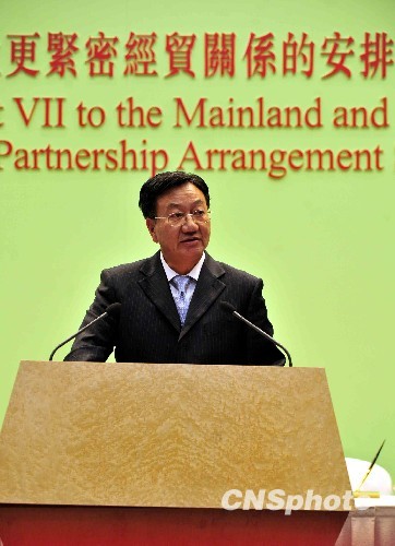 《內(nèi)地與香港關(guān)于建立更緊密經(jīng)貿(mào)關(guān)系的安排》補充協(xié)議七簽署儀式,5月27日在香港舉行。商務(wù)部副部長姜增偉致辭時表示,補充協(xié)議七在服務(wù)貿(mào)易的內(nèi)容上進一步深化,進一步開放內(nèi)地市場,為內(nèi)地經(jīng)濟帶來活力,亦加強兩地在優(yōu)勢領(lǐng)域上合作。 中新社發(fā) 譚達明 攝