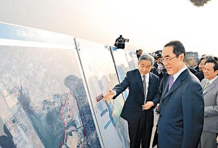 率領(lǐng)三十多名商界精英到前海考察的唐英年,聽(tīng)取前,F(xiàn)代服務(wù)業(yè)合作區(qū)介紹