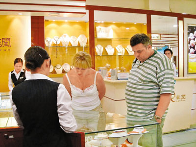 海南省從2011年元旦日開始率先試行離境退稅政策,包括香港人在內的境外游客在指定商店購買退稅物品達800元人民幣,可以退回11%的稅。圖為外國游客在海南購物