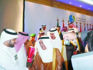 14日在新聞發(fā)布會開始前,沙特石油部長納伊米受到媒體“圍攻” 本報記者 朱周良 攝