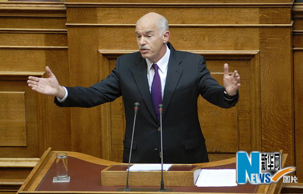 5月6日,在希臘首都雅典,希臘總理帕潘德里歐在議會發(fā)表講話。當日,希臘議會經(jīng)過激烈辯論,通過了帕潘德里歐政府提出的新緊縮措施,以換取歐盟和國際貨幣基金組織1100億歐元的救助款。希臘政府需要實施嚴厲的緊縮政策,包括大幅削減公務員工資、增加稅收以及在未來3年內(nèi)削減財政預算300億歐元,以便在2014年將財政赤字控制在國內(nèi)生產(chǎn)總值的3%以內(nèi)。新華社發(fā)