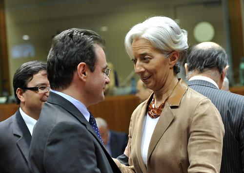 5月9日,在比利時(shí)首都布魯塞爾,法國經(jīng)濟(jì)、財(cái)政與就業(yè)部長拉加德(右)與希臘財(cái)政部長帕帕康斯坦季努在歐盟財(cái)政部長特別會議舉行前交談。當(dāng)天,歐盟舉行財(cái)長特別會議,討論捍衛(wèi)歐元穩(wěn)定、增強(qiáng)市場信心的具體實(shí)施方案。不斷升級的希臘債務(wù)危機(jī)和歐盟其他國家高額的公共債務(wù),使得市場對歐元區(qū)和歐元的前景普遍擔(dān)憂。今年以來,歐元兌美元匯率已經(jīng)下跌超過10%。歐盟機(jī)構(gòu)和歐元區(qū)國家領(lǐng)導(dǎo)人在7日特別峰會后表示將“不惜一切代價(jià)”捍衛(wèi)歐元和歐元區(qū)的穩(wěn)定。新華社記者武巍攝