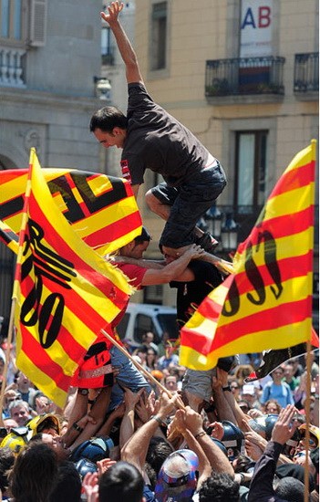 巴塞羅那的罷工,當(dāng)?shù)毓と嗽噲D疊起一座人塔,抗議政府削減開(kāi)支的緊縮政策。
