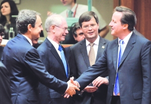 圖為歐盟輪值主席國西班牙首相薩帕特羅、歐洲理事會常任主席范龍佩、荷蘭首相巴爾克嫩德歡迎首次參加歐盟首腦會議的英國首相卡梅倫(從左至右)。新華社圖片