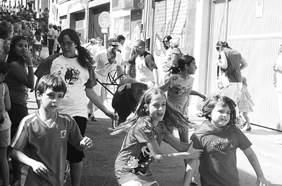 8月26日,圣塞巴斯蒂安·德·洛斯雷耶斯專為兒童舉辦了奔牛節(jié)。圖為孩子們正在和人力控制的“奔牛”賽跑。 人民網(wǎng)記者 丁大偉攝