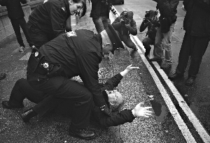 11月21日,都柏林,一名抗議者被警察制服。當(dāng)天,愛(ài)爾蘭內(nèi)閣討論是否向歐盟遞交求援申請(qǐng),引發(fā)抗議。